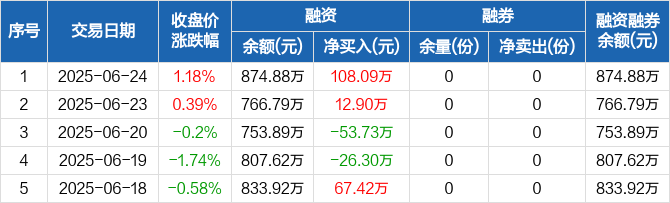 融资方面,当日融资买入235.07万元,融资偿还126.98万元,融资净买入108.09万元。融券方面,融券卖出0份,融券偿还0份,融券余量0份,融券余额0元。融资融券余额合计874.88万元。