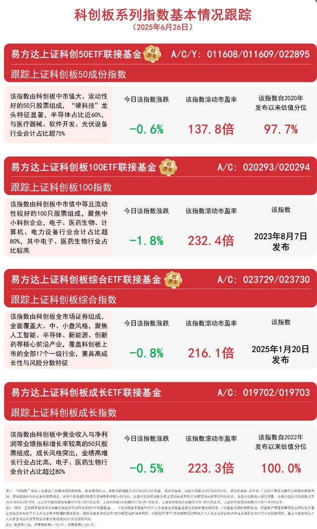 截至收盘,上证科创板50成份指数下跌0.6%,上证科创板成长指数下跌0.5%,科创综指下跌0.8%,科创100指数下跌1.8%。