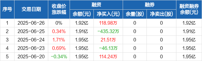 融资方面,当日融资买入547.17万元,融资偿还428.19万元,融资净买入118.98万元。融券方面,融券卖出0股,融券偿还0股,融券余量0股,融券余额0元。融资融券余额合计1.92亿元。