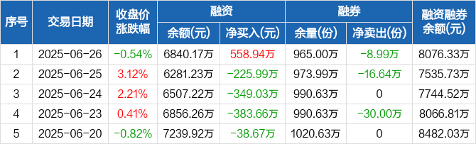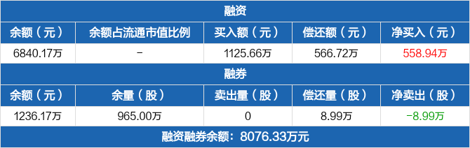 融资方面,当日融资买入1125.66万元,融资偿还566.72万元,融资净买入558.94万元。融券方面,融券卖出0份,融券偿还8.99万份,融券余量965万份,融券余额1236.17万元。融资融券余额合计8076.33万元。