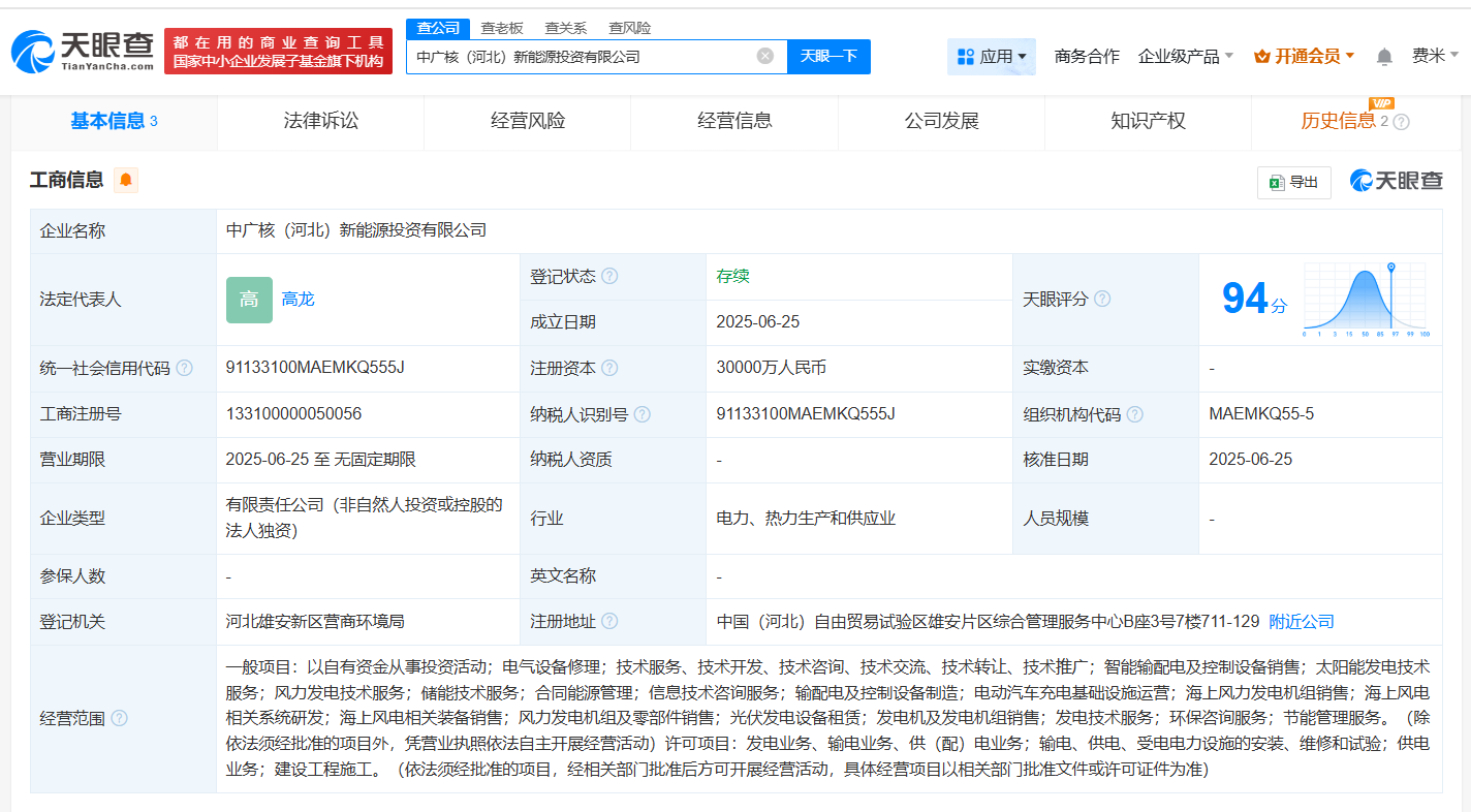 近日,中广核(河北)新能源投资有限公司成立,法定代表人为高龙,注册资本3亿人民币,经营范围包括以自有资金从事投资活动、电气设备修理、智能输配电及控制设备销售、太阳能发电技术服务、风力发电技术服务、储能技术服务等,由中广核风电有限公司全资持股。
