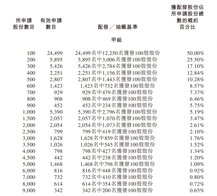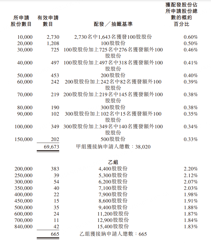 公开发售阶段泰德医药获301.15倍认购,经重新分配后,公开发售的发售股份最终数目为840万股股份,占发售股份总数的约50%。合共接获约70338份有效申请,受理申请数目约38685份,申购一手获配发股份占所申请股份总数的概约百分比为50%。