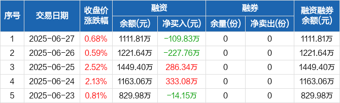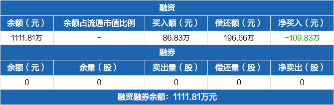 融资方面,当日融资买入86.83万元,融资偿还196.66万元,融资净偿还109.83万元。融券方面,融券卖出0份,融券偿还0份,融券余量0份,融券余额0元。融资融券余额合计1111.81万元。