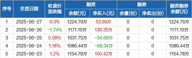 融资方面,当日融资买入133.15万元,融资偿还79.49万元,融资净买入53.66万元。融券方面,融券卖出0份,融券偿还0份,融券余量0份,融券余额0元。融资融券余额合计1224.76万元。