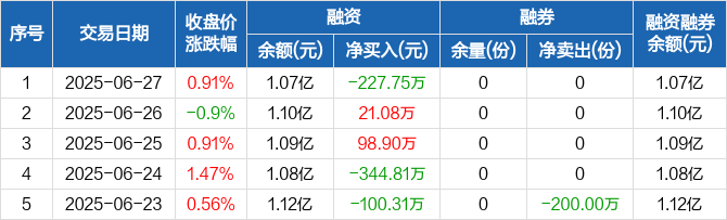 融资方面,当日融资买入745.44万元,融资偿还973.19万元,融资净偿还227.75万元。融券方面,融券卖出0份,融券偿还0份,融券余量0份,融券余额0元。融资融券余额合计1.07亿元。