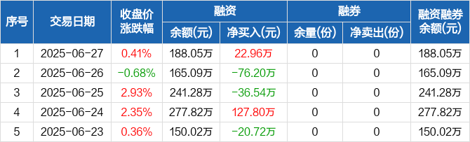 融资方面,当日融资买入74.43万元,融资偿还51.47万元,融资净买入22.96万元。融券方面,融券卖出0份,融券偿还0份,融券余量0份,融券余额0元。融资融券余额合计188.05万元。