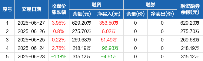 融资方面,当日融资买入2795.28万元,融资偿还2441.78万元,融资净买入353.5万元,连续3日净买入累计411.01万元。融券方面,融券卖出0份,融券偿还0份,融券余量0份,融券余额0元。融资融券余额合计629.2万元。
