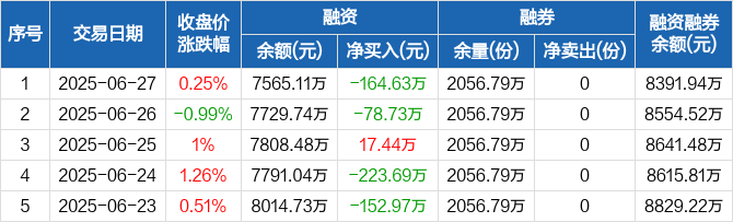 融资方面,当日融资买入286.35万元,融资偿还450.99万元,融资净偿还164.63万元。融券方面,融券卖出0份,融券偿还0份,融券余量2056.79万份,融券余额826.83万元。融资融券余额合计8391.94万元。