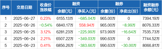 创业板ETF广发融资融券信息显示,2025年6月27日融资净偿还685.04万元;融资余额6155.13万元,较前一日下降10.02%。