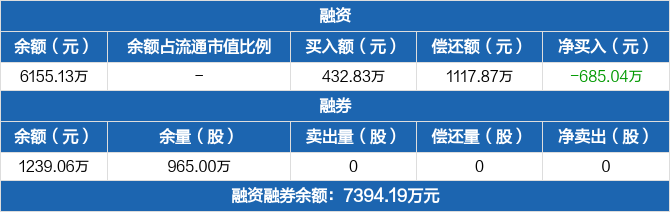 融资方面,当日融资买入432.83万元,融资偿还1117.87万元,融资净偿还685.04万元。融券方面,融券卖出0份,融券偿还0份,融券余量965万份,融券余额1239.06万元。融资融券余额合计7394.19万元。