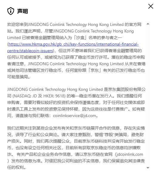 值得一提的是,京东币链科技(香港)有限公司还在官网发布声明称,尽管公司已被香港金融管理局纳入为“沙盒”名单的参与者之一,但这并不意味着公司已获得香港金融管理局的任何认可或被授予、或被视为已获得了稳定币发行许可。潜在的稳定币申购者请注意,公司从未在香港或其他司法管辖区发行稳定币,任何宣称跟京东有关的已发行稳定币也可能是骗局。
