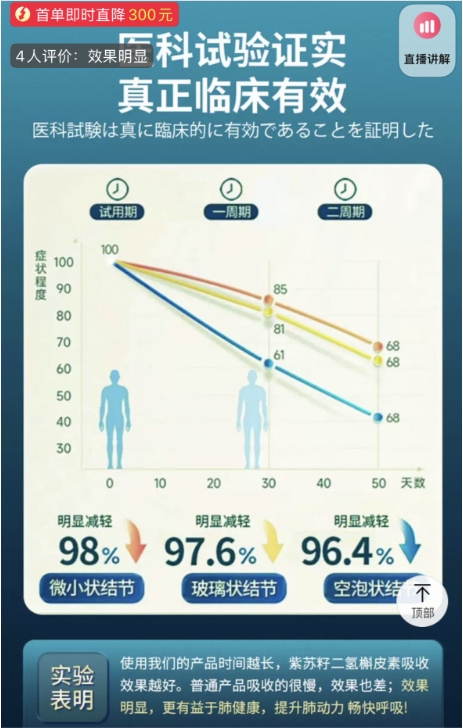 另一款售价高达近1300元/盒的“软胶丸”产品,则宣称其为日本进口,主要成分为泛菌糖脂质。其自称“经医科试验证实真正临床有效”,并在示意图中写着“经过两周期,微小肺结节明显减轻98%、玻璃状结节减轻97.6%、空泡状结节减轻96.4%”。