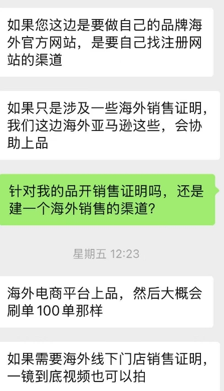 除了生产地和资质问题,该代工厂还可以提供一系列配套服务。为了解决消费者在国外电商网站上搜不到同类产品的风险,前述人员称:“我们会协助客户将代工产品在海外平台上架,再刷100单左右的成交记录。如果需要海外线下门店销售证明,也可以提供一镜到底视频拍摄。”