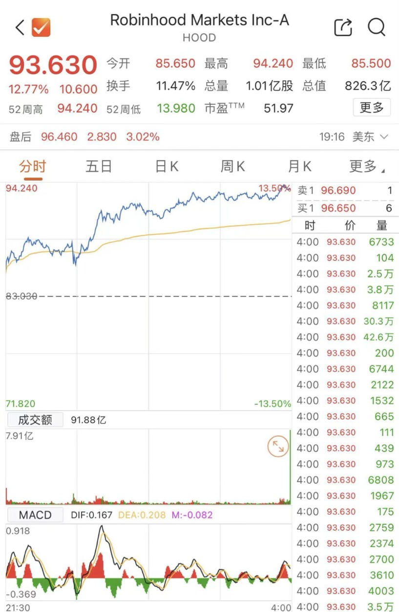 大型科技股集体上涨,微软、Meta、奈飞均小幅收涨并创盘中历史新高,苹果收涨2%。Robinhood收盘上涨13%,创下4月9日以来的最佳单日表现。