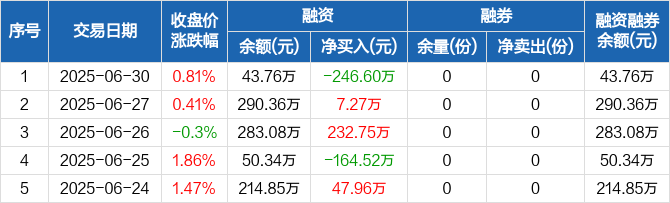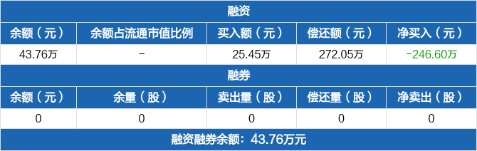 融资方面,当日融资买入25.45万元,融资偿还272.05万元,融资净偿还246.6万元。融券方面,融券卖出0份,融券偿还0份,融券余量0份,融券余额0元。融资融券余额合计43.76万元。