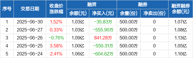 融资方面,当日融资买入334.73万元,融资偿还370.56万元,融资净偿还35.83万元。融券方面,融券卖出0份,融券偿还0份,融券余量500万份,融券余额467.5万元。融资融券余额合计1.07亿元。