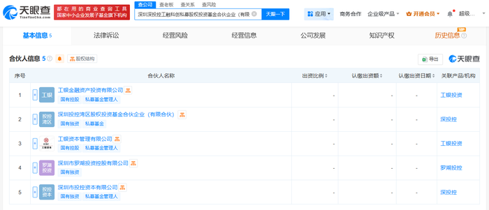 天眼查App显示,近日,深圳深投控工融科创私募股权投资基金合伙企业(有限合伙)成立,执行事务合伙人为深圳市投控资本有限公司、工银资本管理有限公司,出资额20亿人民币,经营范围包括以私募基金从事股权投资、投资管理、资产管理等活动。合伙人信息显示,该基金由工银金融资产投资有限公司、深圳投控湾区股权投资基金合伙企业(有限合伙)、深圳市罗湖投资控股有限公司等共同出资。