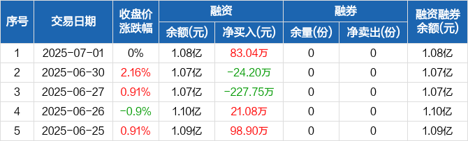 融资方面,当日融资买入715万元,融资偿还631.96万元,融资净买入83.04万元。融券方面,融券卖出0份,融券偿还0份,融券余量0份,融券余额0元。融资融券余额合计1.08亿元。