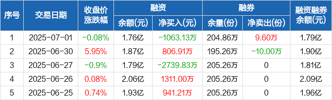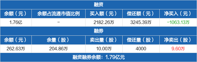 融资方面,当日融资买入2182.26万元,融资偿还3245.39万元,融资净偿还1063.13万元。融券方面,融券卖出10万份,融券偿还4000份,融券余量204.86万份,融券余额262.63万元。融资融券余额合计1.79亿元。