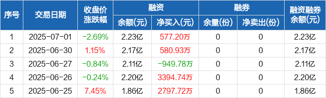融资方面,当日融资买入3549.13万元,融资偿还2971.94万元,融资净买入577.2万元。融券方面,融券卖出0份,融券偿还0份,融券余量0份,融券余额0元。融资融券余额合计2.23亿元。