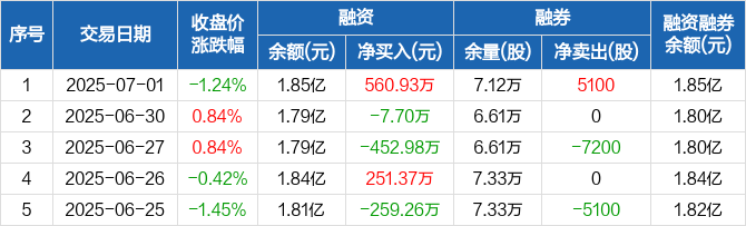 融资方面,当日融资买入905.76万元,融资偿还344.82万元,融资净买入560.93万元。融券方面,融券卖出7100股,融券偿还2000股,融券余量7.12万股,融券余额33.89万元。融资融券余额合计1.85亿元。