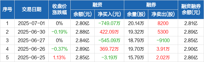 融资方面,当日融资买入799.57万元,融资偿还1548.64万元,融资净偿还749.07万元。融券方面,融券卖出9600股,融券偿还1400股,融券余量20.14万股,融券余额107.75万元。融资融券余额合计2.81亿元。