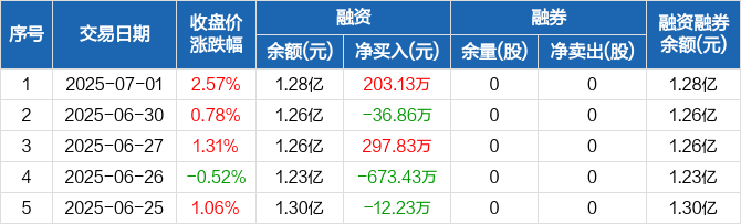 融资方面,当日融资买入1321.24万元,融资偿还1118.11万元,融资净买入203.13万元。融券方面,融券卖出0股,融券偿还0股,融券余量0股,融券余额0元。融资融券余额合计1.28亿元。