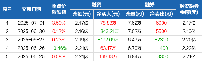 融资方面,当日融资买入3170.91万元,融资偿还3092.08万元,融资净买入78.83万元。融券方面,融券卖出6600股,融券偿还600股,融券余量7.62万股,融券余额68.12万元。融资融券余额合计2.17亿元。