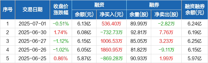 融资方面,当日融资买入3164.83万元,融资偿还2628.44万元,融资净买入536.4万元。融券方面,融券卖出3.73万股,融券偿还6.55万股,融券余量89.99万股,融券余额1046.58万元。融资融券余额合计6.24亿元。