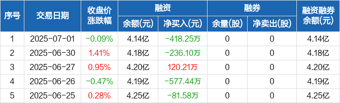 融资方面,当日融资买入1099.55万元,融资偿还1517.8万元,融资净偿还418.25万元。融券方面,融券卖出0股,融券偿还0股,融券余量0股,融券余额0元。融资融券余额合计4.14亿元。