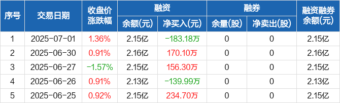 融资方面,当日融资买入3266.46万元,融资偿还3449.64万元,融资净偿还183.18万元。融券方面,融券卖出0股,融券偿还0股,融券余量0股,融券余额0元。融资融券余额合计2.15亿元。