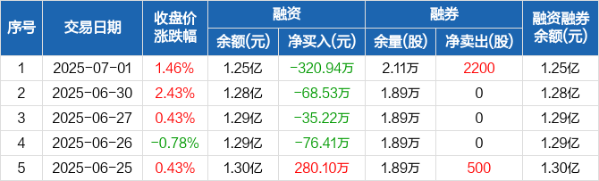 融资方面,当日融资买入753.44万元,融资偿还1074.38万元,融资净偿还320.94万元,连续4日净偿还累计501.09万元。融券方面,融券卖出2200股,融券偿还0股,融券余量2.11万股,融券余额30.7万元。融资融券余额合计1.25亿元。