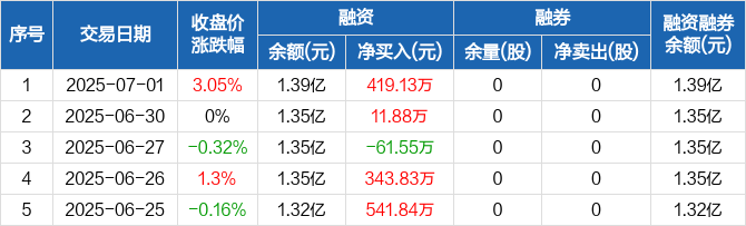 融资方面,当日融资买入1227.15万元,融资偿还808.02万元,融资净买入419.13万元。融券方面,融券卖出0股,融券偿还0股,融券余量0股,融券余额0元。融资融券余额合计1.39亿元。