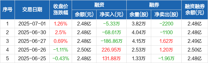 融资方面,当日融资买入427.09万元,融资偿还432.42万元,融资净偿还5.33万元,连续3日净偿还累计260.8万元。融券方面,融券卖出1700股,融券偿还3900股,融券余量3.82万股,融券余额46.07万元。融资融券余额合计2.48亿元。