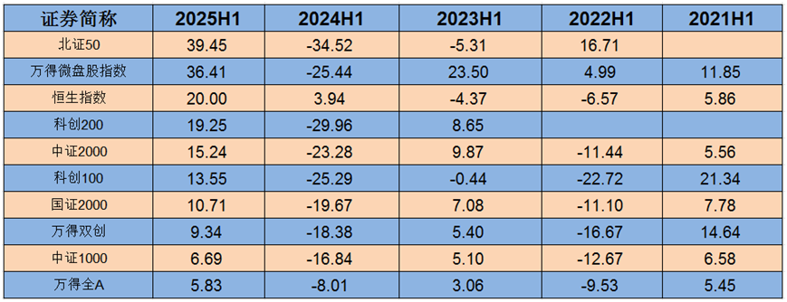 Wind数据显示,39个A股市场核心指数中,上半年有28个指数实现上涨,8个涨幅在10%以上,以涨幅前十的平均涨幅来看,为近五年同期之最。其中,近五年涨幅第一和第二的分别是北证50和万得微盘股指数,录得39.45%和36.41%。