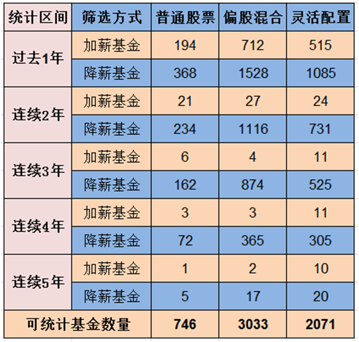 注:“加薪”基金筛选标准为,成立满3年、每个过去一年年化超额收益率大于6%且年化回报率大于1.5%;“降薪”筛选标准为,成立满3年、每个过去一年年化超额收益率-3%及以下。