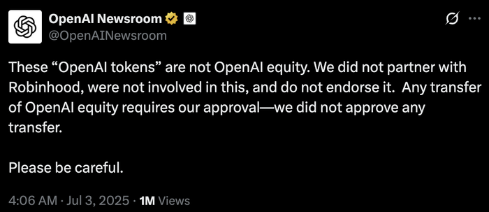 OpenAI发布公告,称Robinhood推出的“OpenAI代币”与其无关。