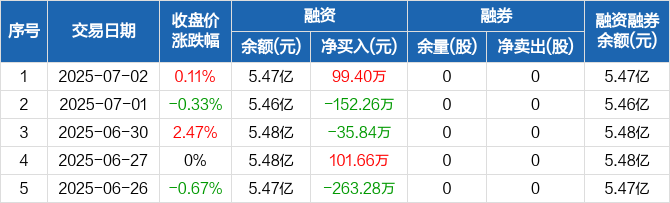 齐峰新材融资融券信息显示,2025年7月2日融资净买入99.4万元;融资余额5.47亿元,较前一日增加0.18%。