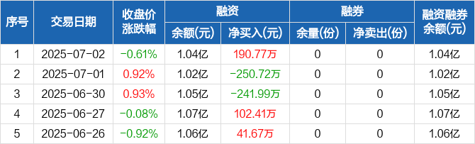 融资方面,当日融资买入726.34万元,融资偿还535.57万元,融资净买入190.77万元。融券方面,融券卖出0份,融券偿还0份,融券余量0份,融券余额0元。融资融券余额合计1.04亿元。