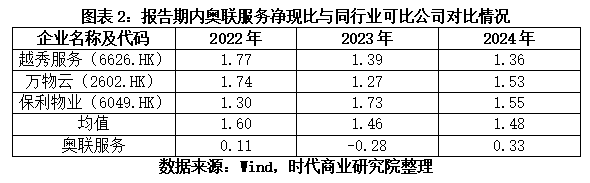 对比来看,报告期内,奥联服务的净现比(经营活动现金流量净额与年内利润的比值,下同)分别为0.11、-0.28、0.33,而同期同行业可比公司净现比均值分别为1.60、1.46、1.48,奥联服务的净现比均未超过1且远低于同行业可比公司均值。