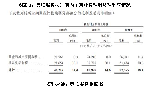 而出现上述情况的主要原因是奥联服务两大业务的毛利率差距较大,商企和城市空间服务的毛利率在8%左右,仅2024年的毛利率突破两位数,而社区生活服务的毛利率则保持在30%左右。