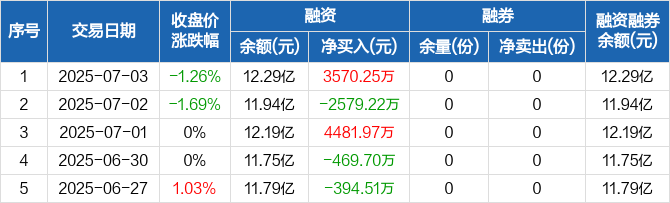 融资方面,当日融资买入1.9亿元,融资偿还1.55亿元,融资净买入3570.25万元。融券方面,融券卖出0份,融券偿还0份,融券余量0份,融券余额0元。融资融券余额合计12.29亿元。