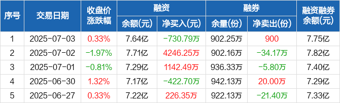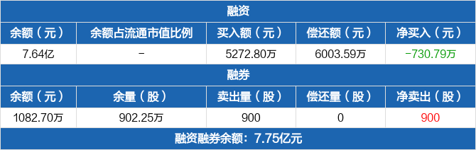 融资方面,当日融资买入5272.8万元,融资偿还6003.59万元,融资净偿还730.79万元。融券方面,融券卖出900份,融券偿还0份,融券余量902.25万份,融券余额1082.7万元。融资融券余额合计7.75亿元。