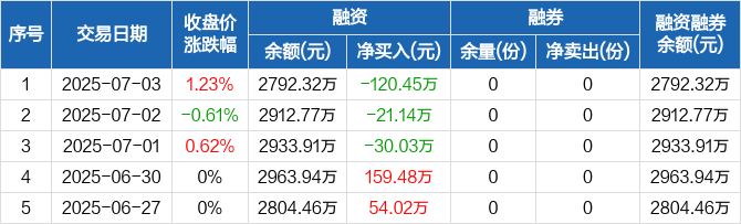 融资方面,当日融资买入130.5万元,融资偿还250.95万元,融资净偿还120.45万元,连续3日净偿还累计171.62万元。融券方面,融券卖出0份,融券偿还0份,融券余量0份,融券余额0元。融资融券余额合计2792.32万元。