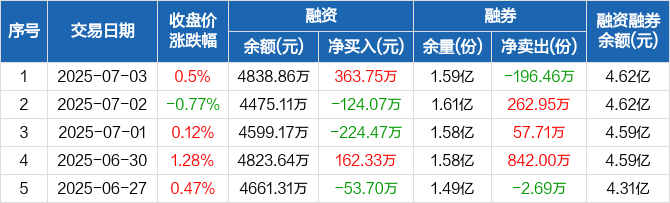 融资方面,当日融资买入898.52万元,融资偿还534.77万元,融资净买入363.75万元。融券方面,融券卖出3.54万份,融券偿还200万份,融券余量1.59亿份,融券余额4.14亿元。融资融券余额合计4.62亿元。