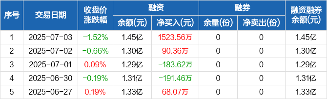 融资方面,当日融资买入2389.47万元,融资偿还865.91万元,融资净买入1523.56万元。融券方面,融券卖出0份,融券偿还0份,融券余量0份,融券余额0元。融资融券余额合计1.45亿元。