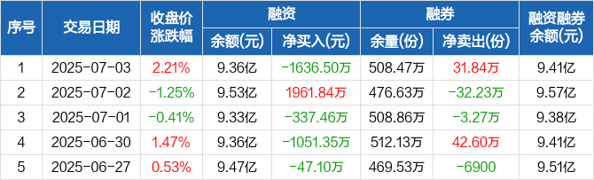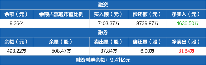 融资方面,当日融资买入7103.37万元,融资偿还8739.87万元,融资净偿还1636.5万元。融券方面,融券卖出37.84万份,融券偿还6万份,融券余量508.47万份,融券余额493.22万元。融资融券余额合计9.41亿元。