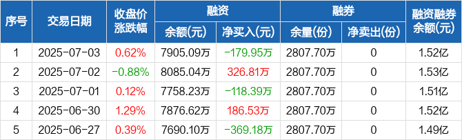 融资方面,当日融资买入618.75万元,融资偿还798.7万元,融资净偿还179.95万元。融券方面,融券卖出0份,融券偿还0份,融券余量2807.7万份,融券余额7285.98万元。融资融券余额合计1.52亿元。