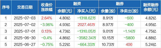 融资方面,当日融资买入2280.32万元,融资偿还3598.94万元,融资净偿还1318.62万元。融券方面,融券卖出400股,融券偿还1000股,融券余量8.91万股,融券余额197.45万元。融资融券余额合计4.82亿元。