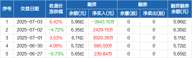 融资方面,当日融资买入3239.31万元,融资偿还7182.46万元,融资净偿还3943.15万元。融券方面,融券卖出0股,融券偿还0股,融券余量0股,融券余额0元。融资融券余额合计5.96亿元。